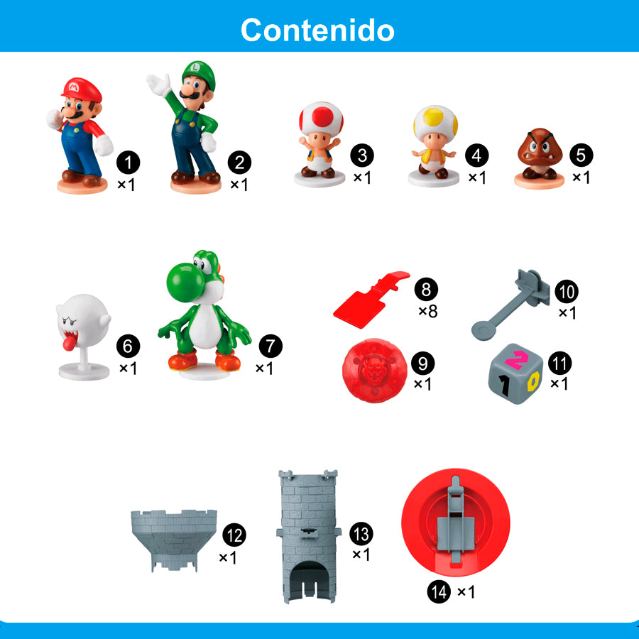 El artículo contiene 7 figuras coleccionables, compatibles con otros juguetes y juegos de mesa Super Mario de Epoch Games.